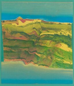 In artworks by the painter and poet Arthur Yap (1943–2006), chromatic eddies between warm and cool tones evoke a balanced commingling of land and water. These semi-abstract images feature a congruous interplay of watery bluish greens and dusty yellowish reds and browns. In Window View (1984), for instance, aquamarine and cerulean recall rainfall and puddles or pools, as well as larger bodies of freshwater or sea, while tawny shades of terracotta and lemon evoke vegetation, sand, and solid earth. Similarly, in Landscape and Landscape II (both 1980), meandering lines ambiguously suggest aerial views of coastline, and panoramic vistas of a tidal landscape, and perhaps even geological strata or meteorological data.