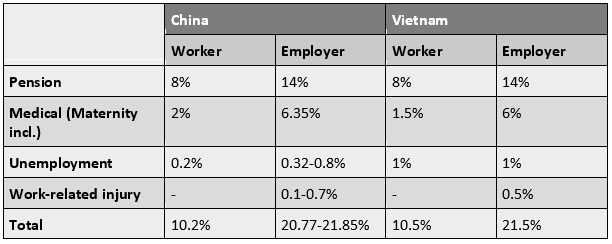 Source: Developed by authors, with data from Social Security Programs throughout the World: Asia and the Pacific, 2018 (ISSA, 2019). In contrast to China, Vietnamese workers have to pay two percent towards trade union contributions.